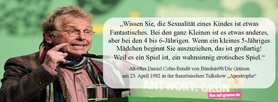 Ein Jahr nachdem Genosse Jürgen Trittin seinen „Theodor-Adorno“ unter ein Wahlprogramm der Grünen setzte, in welchem Straffreiheit für Sexuellen Missbrauch von Kindern gefordert wurde, äußerte sich Dany le Rouge in der Französischen Abendsendung „Apostrophes“ zu seinen Erlebnissen und Fantasien. Heute sollen das alles „Jugendsünden“ und „Provokationen“ gewesen sein. So lesen wir nunmehr in der FAZ; „Daniel Cohn-Bendit ist nicht interessiert, die Geschichte seiner pädophilen Äußerungen transparent zu machen. Sein Büro hat dazu einen Bestand von belastenden Archivmaterial mit der Überschrift `Pressekampagnen gegen Daniel Cohn-Bendit` bis zum Jahr 2031 gesperrt!“