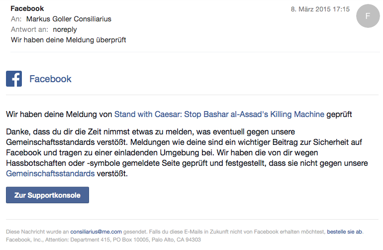 So unappetitlich diese Bilder auch sind, es stellt sich hier nicht die Frage des Geschmacks, sondern die Frage, inwieweit diese schrecklichen Bilder so zu Propagandazwecken missbraucht werden dürfen. Der auf dieser Seite hervorgebrachte Grund, „man wolle diese Veröffentlichungen dazu benutzen, um die Opfer zu identifizieren“ kommt mehr als Scheinheilig daher. Wäre es an dem, würde dies über eine offizielle Seite der Regierung oder NGO´s kommen, nicht aber auf einer offensichtlichen Hetzkampagnen Seite wie dieser „Butcher…“ Darstellung. Also fand ich, ich muss hier handeln und meldete diese Seite wegen Verhetzung und Verletzung der Persönlichkeitsrechte (hier die Opfer) an Facebook und bekam prompt eine für mich unfassbare Antwort…: