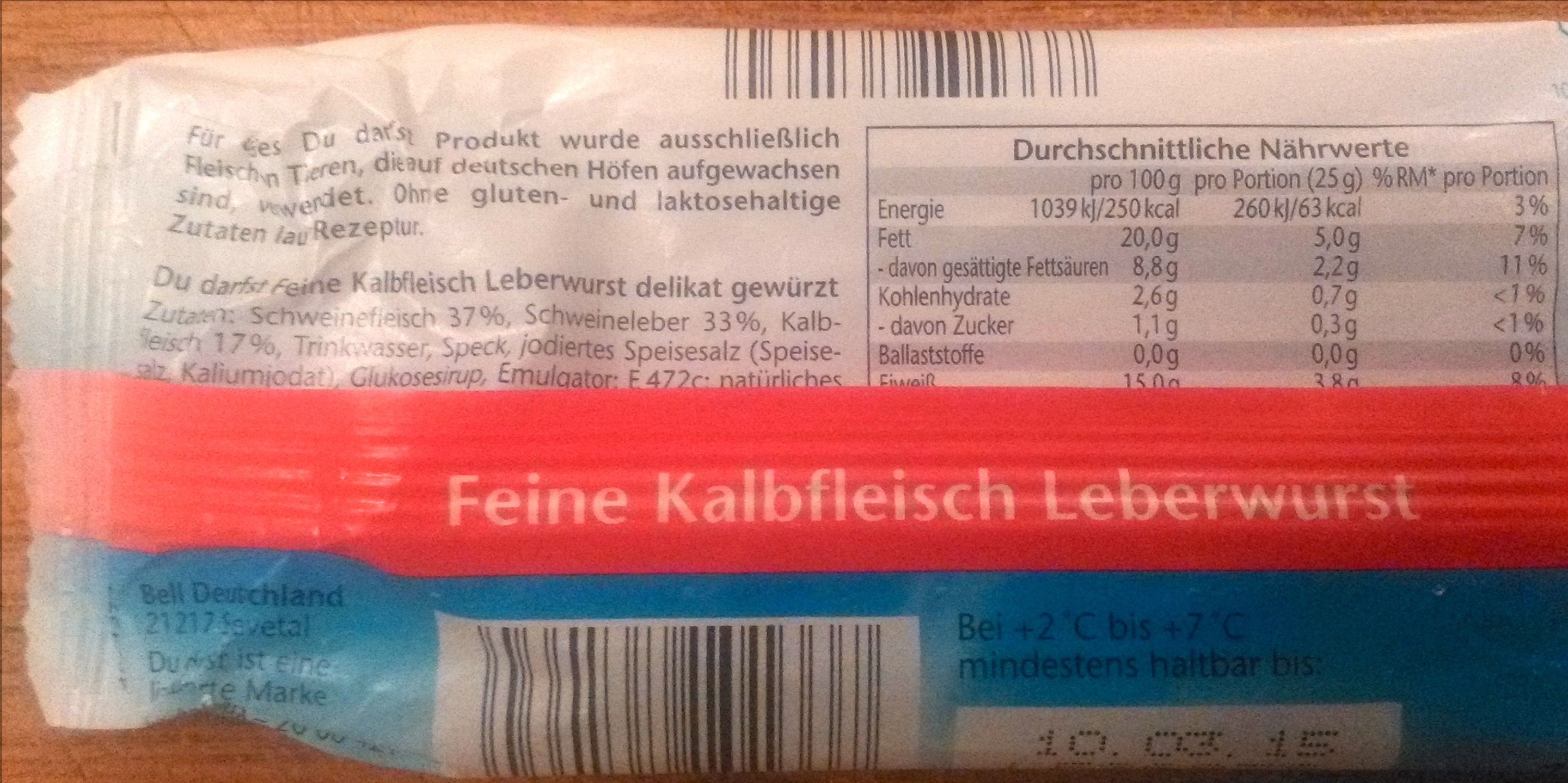 Zu Hause angekommen und die frisch erworbene Ware zünftig auf den Abendbrot Tisch gepackt, packte mich sofort das große Entsetzen. Als ich die Verpackung entfernen wollte, fühlte ich mich regelrecht zum Narren gehalten. Meine Augen trauten kaum dem, was sie zu sehen bekamen und doch war es unwiderruflich klar, dass dort eine schreckliche Wahrheit stand. Kalbfleisch Leberwurst werdet Ihr jetzt sagen, doch NEIN, seht genauer hin…