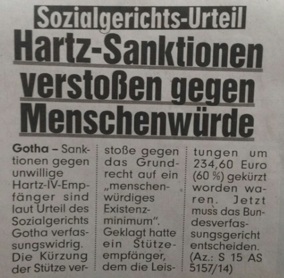 Ich dachte immer, dass Hartz IV als Solches schon MENSCHENUNWÜRDIG IST! Zumindest ist dieses Urteil, sofern es vor dem BVG Bestand hat, ein Schritt in die richtige Richtung…