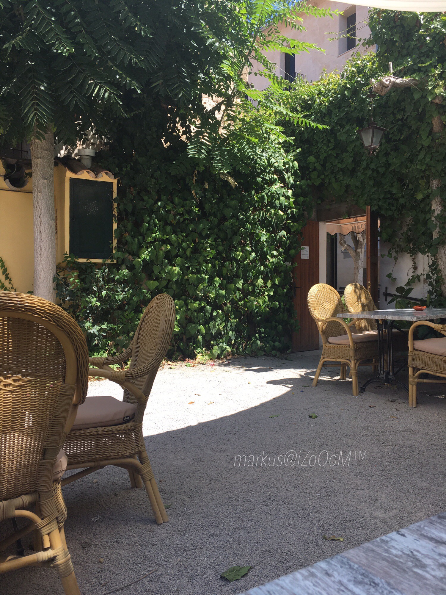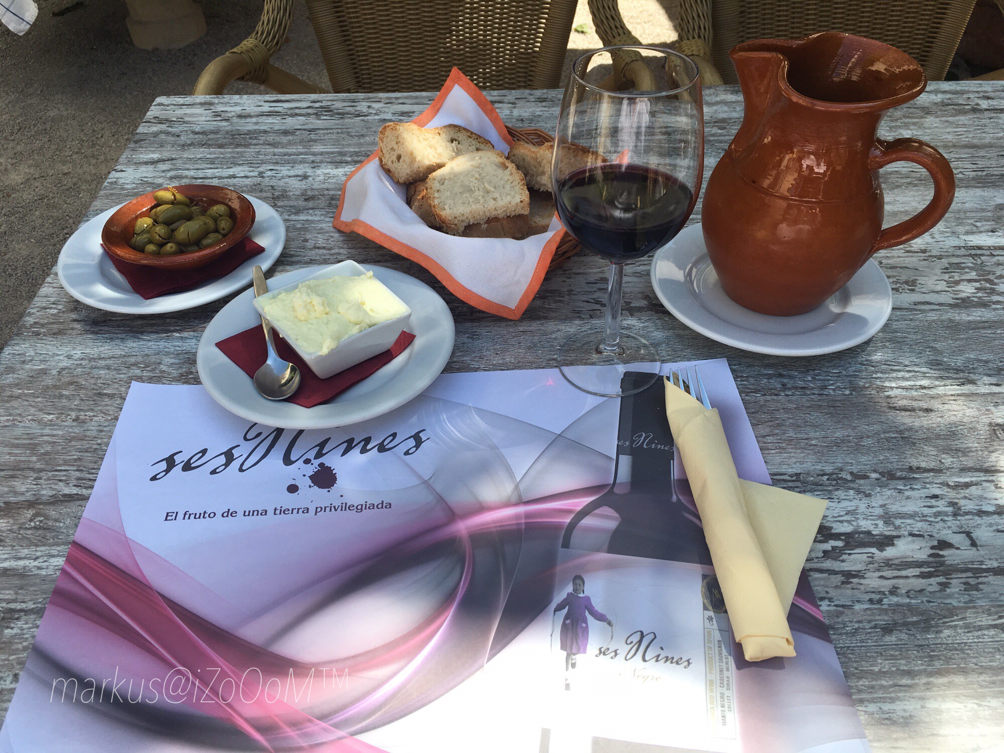 Viel braucht es nicht, um den Wohlfühlcharakter herzustellen. Ein unscheinbarer Hinterhof kann schnell zu einer Oase der Entspannung werden. Das Wichtigste, wenn man bei einem Winzer einkehrt, ist natürlich der Wein. In diesem Falle ohne Frage natürlich der Hauswein. Zünftig serviert im mallorquinischen Tonkrug.