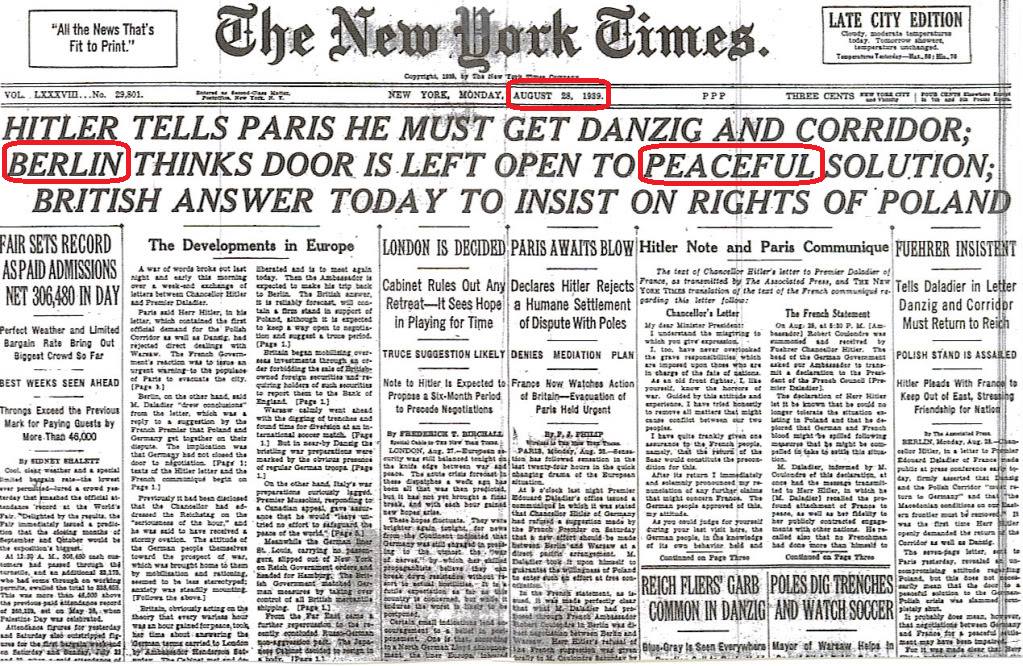 Zwei Tage vor Ausbruch des 2´ten Weltkriegs berichtet die New York Times; Hitler sagt: „Berlin denkt die Tür ist offen für eine Friedliche Lösung„!