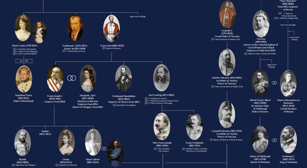 Die Habsburger, ein mächtiges europäisches Fürstengeschlecht, benannt nach ihrer Stammburg im heutigen Schweizer Aargau, das über Jahrhunderte zu einer der einflussreichsten Dynastien Europas aufstieg. Ab dem Jahr 1273 herrschten die Habsburger über das Herzogtum Österreich und bauten ihre Machtbasis dort aus. Ausgehend von der Herrschaft über Österreich, dehnte sich ihr Einfluss durch Heirat und Erbschaft auf große Teile Europas, einschließlich Spanien, Portugal und den Niederlanden, aus. Das Haus erlosch im Mannesstamm 1740, woraufhin es als Haus Habsburg-Lothringen fortbestand und bis 1918 die Kaiser von Österreich stellte.