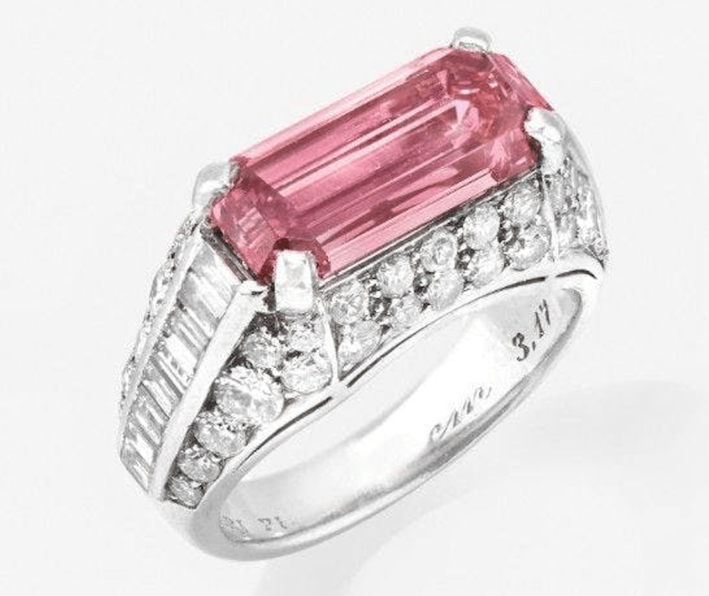 Die Frau brachte den unscheinbaren Ring ihrer Grossmutter zur Schätzung ins Auktionshaus Aste Bolaffi in Turin, Italien. Doch was sie für ein Schmuckstück mit einem schlichten Rosenquarz hielt, entpuppte sich als eine Sensation. Der Ring war kein gewöhnliches Schmuckstück, sondern ein Vintage-Platin-Bulgari «Trombino» aus den frühen 1970er-Jahren. Der rechteckig geschliffene Diamant ist von der GIA als Natural Fancy Intense Pink, VS2, Typ IIa zertifiziert; Eigenschaften, die ihn zu einem Unikat in der internationalen Sammlerlandschaft machen. 64 kleine Brillanten und Baguette-Diamanten mit zusammen 1,93 Karat rahmen den zentralen, rechteckig geschliffenen Stein ein. Die Experten beschreiben den Juwel wie einen König auf einem Thron mit funkelnden Licht umgeben.