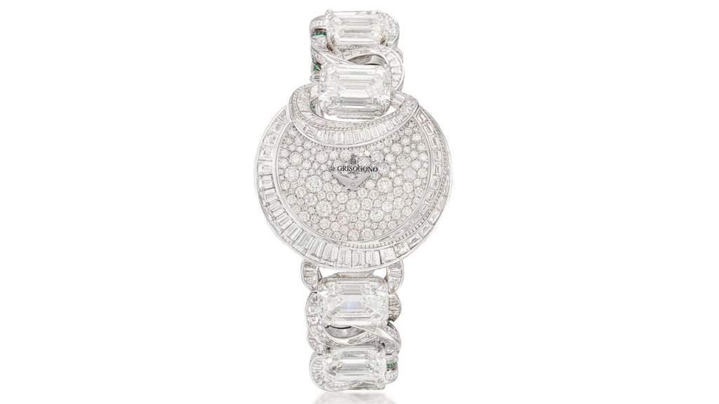 Diese Armbanduhr von de Grisogono Luna brachte 8,1 Millionen HKD (1 Million Dollar) ein, mehr als das Siebenfache ihrer höchsten Schätzung. Es hat ein halbmondförmiges Zifferblatt und eine Lünette mit Brillantschliff und Baguette-Diamanten. Das diamantbesetzte kreisförmige Gliederband enthält sechs Hauptdiamanten im Stufenschliff, darunter einen 7,10 Karat, G-Farbe, VS1-Klarheit sowie kreisförmige und stufengeschliffene Smaragde.