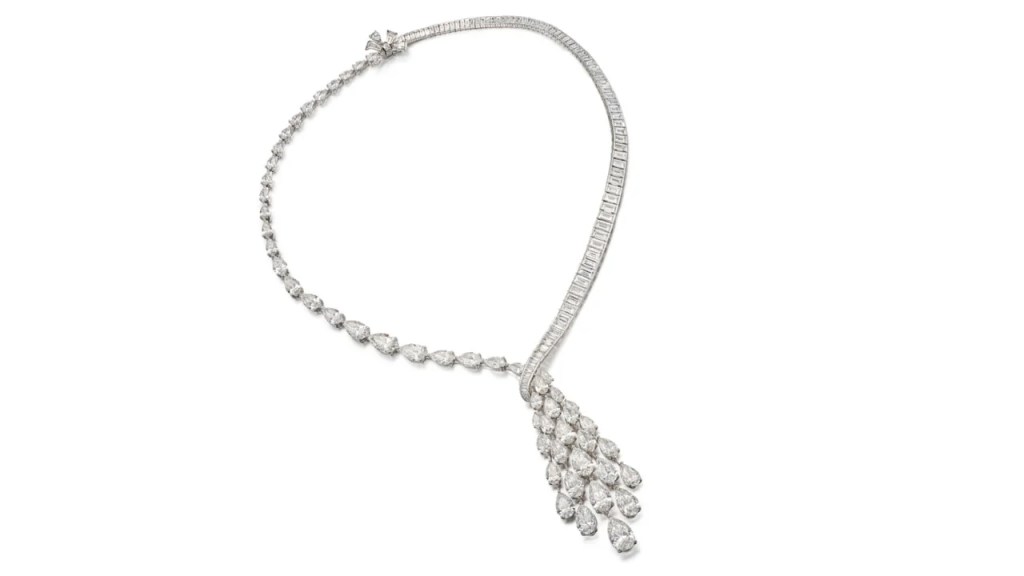 Diese Graff-Halskette ist als Bänder aus abgestuften birnenförmigen und Baguette-Diamanten gestaltet, die eine Quaste aus birnenförmigen Diamanten tragen, mit Steinen, die zwischen 0,90 und 3,01 Karat wiegen, von D bis G-Farbe und innen makellos bis VS2-Klarheit. Sie wechselte den Besitzer für 4,4 Millionen HKD (571.705 $) und übertraf seinen oberen Vorverkaufspreis von 4 Millionen HKD (514.471).