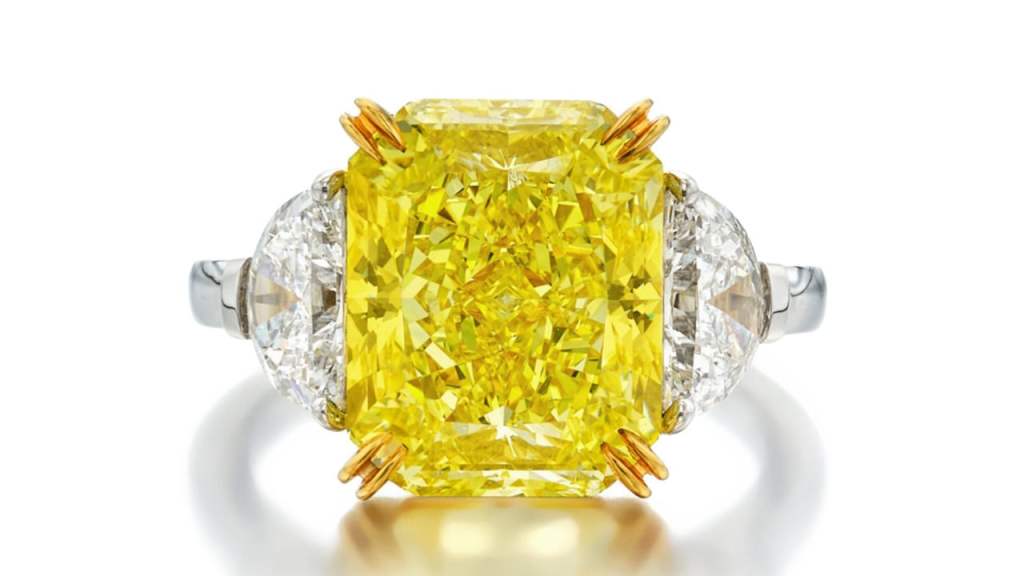 Dieser 6,8 ct große, ausgewöhnlich lebendig Gelbe VS2-Klarheitsdiamant mit rechteckig, modifizierten Brillantschliff zwischen einem Paar Halbmond Diamanten brachte mehr als eineinhalb Mal der höchsten Schätzung 4,4 Millionen HKD (571.705 Dollar) ein.