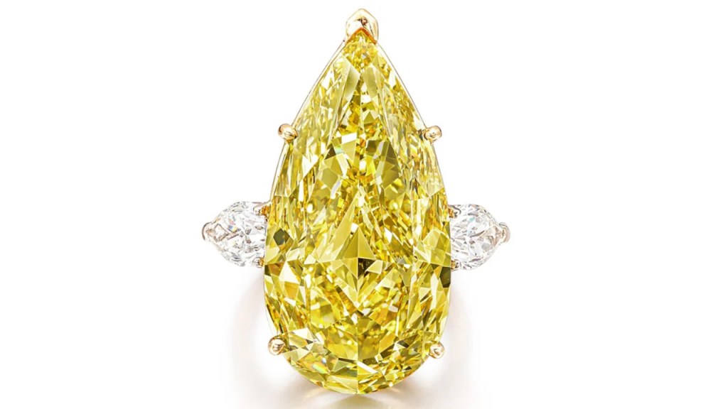 Auch dieser Ring mit einen birnenförmigen, 29,75 ct, ausgefallen-intensiven-gelben VVS1 Klaritäts-Diamanten zwischen zwei birnenförmigen Diamanten übertraf seine obere Schätzung und wurde für 4,1 Millionen HKD (522.702 $) verkauft.