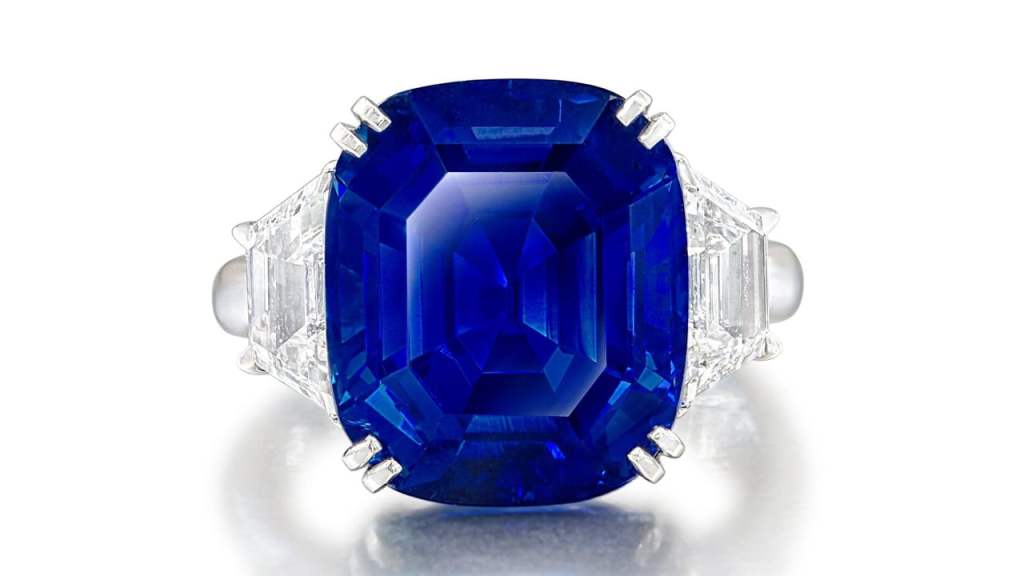 Im Mittelpunkt der Sotheby’s-Auktion in Hongkong, war ein Ring mit einem 12,56 Karat kissenförmigen, königsblauen Kaschmir-Saphir zwischen zwei trapezförmigen Diamanten, der für 18,7 Millionen HKD (2,4 Millionen Dollar) verkauft wurde.