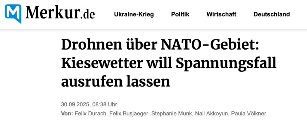 Beim Nato-Gipfel 2022 in Madrid wurde bereits konstatiert: „The euro-atlantic area is not at peace.“ (Der euro-atlantische Raum befindet sich nicht im Frieden) und damit die „Marschrichtung“ vorgegeben, der nun Kiesewetter, Pistorius und Merz brav folgen. Der EU-Verteidigungskommissar Andrius Kubilius hatte am letzten Freitag bereits einen „Drohnenwall“ angekündigt. Die Pläne sind Teil eines größeren Projekts der EU-Ostflanke. Auch Nato-Chef Mark Rutte bestätigt ein solches Projekt als „angemessen und notwendig“. Es wird in Zusammenarbeit mit der Nato umgesetzt. Nicht nur in allen Medien, sondern an jeder Ecke ist spürbar der „Kriegszustand“ eingetroffen. Die BRD ist dabei der zentrale Koordinationspunkt für den „Feldzug Ost“.