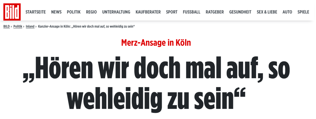 Berufslügner, äh Bundeskanzler und 100 Prozentiger „Wahlversprechenbrecher“ Friedrich Merz (CDU) beruhigt unterdessen laut der Deutschen Presse-Agentur (dpa). Der Bundeskanzler wurde am Rande darauf angesprochen, ob er einen Spannungsfall sehe worauf er antwortete: „Ich sehe das (noch) nicht so.“, also „Niemand hat die Absicht…“!