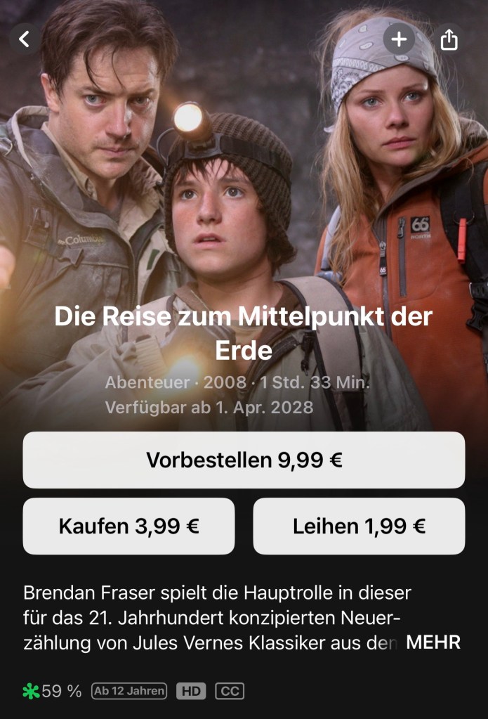 Der Film aus dem Jahr 2008 ist bei Apple TV für 2028 (?!) „Vorbestellbar“ zu einem Preis von 9,99 € aber JETZT schon für 3,99 € erhältlich!