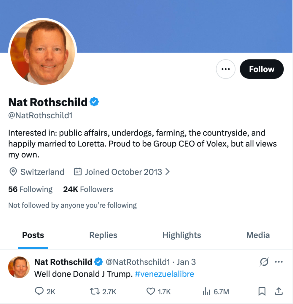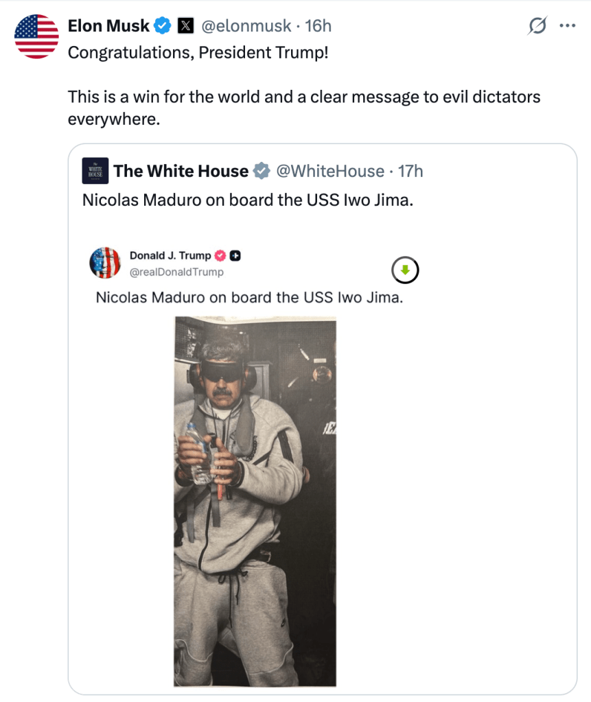 […] Elon beglückwünschte auf seinem X-Account Donald Trump zu seiner „militärischen Sonderoperation“ und dem Kidnapping vom gewählten Staatsoberhaupt Venezuela´s, Nicolás Maduro und änderte seinen Avatar auf die US Flagge, sondern veröffentlichte sogar selbst obigen Text: […]