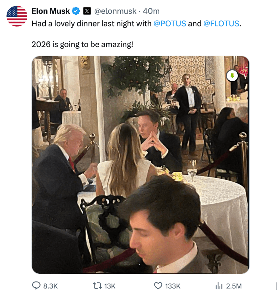 Nach diesem in der ganzen Welt beobachteten Streit, tauchte nun Gestern im Zuge des illegalen US-Überfall´s auf Venezuela ein Gast am Tisch Donald Trump´s auf, mit dem man nun garnicht gerechnet hat; Elon Musk!