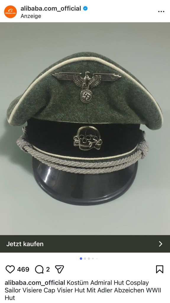 Da haben wir als Erstes mit dem „Cosplay Seemann Cap Admirals Hut“ 🤔 zu tun, der sich unverkennlich als Waffen-SS Infanteriemütze zu erkennen gibt…