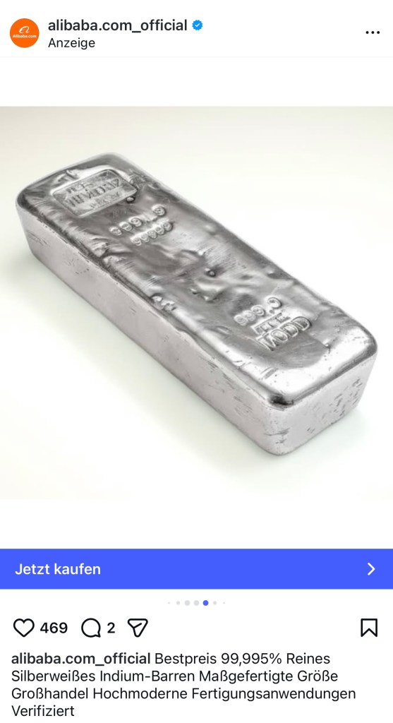 INDIUM ist ein seltenes, weiches, silbrig-weißes Metall aus der Borgruppe, das hauptsächlich für die Elektronikindustrie unerlässlich ist, vor allem in Form von Indiumzinnoxid (ITO) für transparente Leiter in Touchscreens und Flachbildschirmen. Es wird als Nebenprodukt bei der Zinkgewinnung gewonnen und ist aufgrund seiner Knappheit ein kritischer Rohstoff, wobei die Hauptvorkommen in China und Kanada liegen. Vielleicht der neue Anlagetrend, wenn Gold und Silber unbezahlbar werden und bald auf der Verbotsliste der USA und EU zu finden sind, damit sie als „Fluchtwährung“ nicht mehr handelbar sind. Denken wir also mal über das Indium nach und sollten wir in den Besitz kommen, dann die mitangebotene Laserwaffe nicht vergessen, damit wir unsere Schätze angemessen und modern verteidigen können. 😉😎